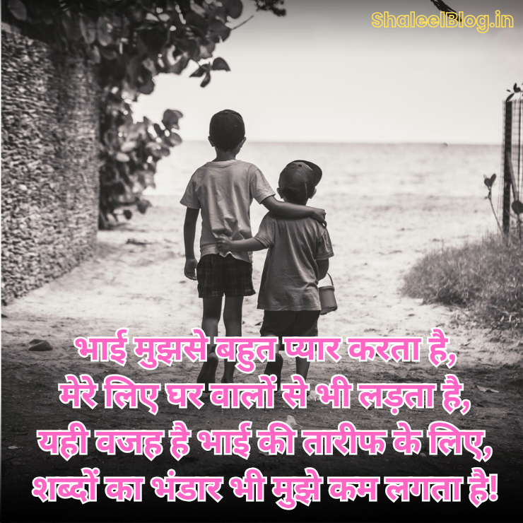 भाई के लिए शायरी ( Bhai Shayari in Hindi ), एक ऐसी खूबसूरत भावना है जिसे शब्दों में व्यक्त किया जा सकता है। भाई वह है जो हमेशा आपके साथ खड़ा होता है, चाहे अच्छे वक्त हो या बुरे। उसकी मौजूदगी में एक तरह की सुरक्षा और विश्वास होता है, जो किसी और रिश्ते में नहीं मिल सकता। भाई से प्यार और उसकी अहमियत को समझाते हुए शायरी के जरिए अपने दिल की बात कह सकते हैं।
